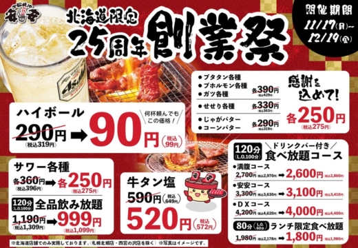 | 営業時間 | 【全日】11時~翌3時 11/17~ 【月~木・日祝・祝前】11時~翌2時 【金・土】11時~翌3時 ・22時から翌朝5時のご注文には、深夜料金として10%加算させていただきます。 |