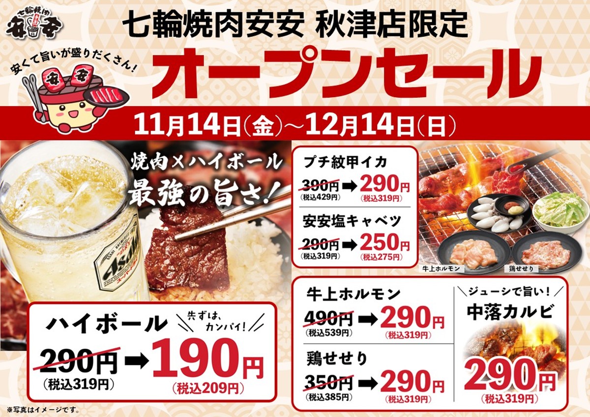「七輪焼肉 安安 秋津店」オープン記念セールを実施します!