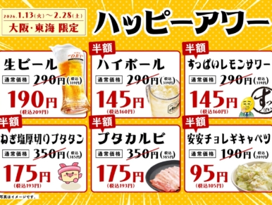 大阪・東海エリア限定※で、お得すぎる「ハッピーアワー」を開催します。