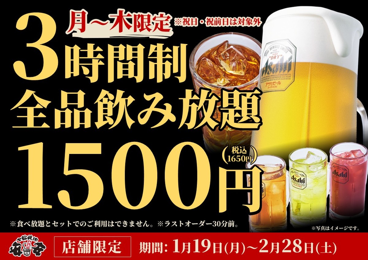 横浜エリアの3店舗、月~木限定で、お得に楽しめる飲み放題フェアを開催します。