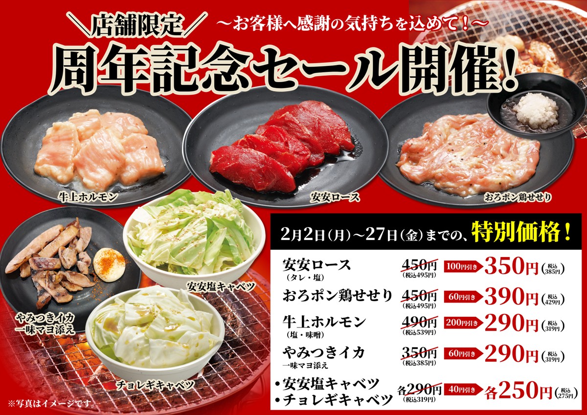 期間中は、安安ロース・牛上ホルモン・おろポン鶏せせりなど、