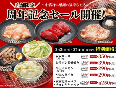 期間中は、安安ロース・牛上ホルモン・おろポン鶏せせりなど、