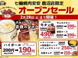 2026.01.13 キャンペーン 焼肉の満足度はご飯で決まる。今だけ“特別”価格【関東※】1/16~… 焼肉の満足度は、肉だけでは決まりません。 最後に記憶に残るのは、実は「ご飯」です。 だから七輪焼肉 安安では今だけ、 焼肉の原点とも言える“肉とご飯の黄金バランス”を 本気の… 2026.01.04 キャンペーン 1/8新規オープン! 鹿沼店【栃木】 オープンセールは2/28ま… 1月8日(木)鹿沼店(栃木)が新規オープン! 1月8日(木)~2月28日(土)までオープンセールを開催!。 鹿沼店限定、今だけの特別価格です。 炭火で焼く焼肉と相性抜群のハイ… 2026.01.01 キャンペーン 12/1~1/31 関東直営店舗「ネット予約限定」食べ放題値引き祭… 関東直営店舗※では、12月1日から1月31日までの「ネット予約限定」食べ放題値引き祭りを開催いたします。 ※秋津店は12/15からの実施となります。※FC相模原2号店・大船店… 2025.11.13 お知らせ 店内でのYouTube等の動画撮影に関してのお願い 店内でのYouTube等の動画撮影に関してのお願い 「他のお客様や従業員(名札も含む)の映り込み」には十分ご注意いただき、お食事中のお客様、従業員のプライバシー保護へのご配慮… 2025.10.16 お知らせ 【大切なお知らせ】公式アプリのログインに関して 誕生日入力エラー・… いつも七輪焼肉 安安をご利用いただき、誠にありがとうございます。公式アプリでは、お客様の情報をより安全に管理するため、ログイン方法を一部変更させていただきました。 ■ 変更内… 2025.09.27 【大切なお知らせ】公式アプリのログイン方法が変わります 9/29~ いつも七輪焼肉 安安をご利用いただき、誠にありがとうございます。公式アプリでは、お客様の情報をより安全に管理するため、ログイン方法を一部変更させていただきます。 ※変更日は9… 2025.09.24 キャンペーン 10/1より関東地区メニュー一新!安安で新しい焼肉体験を 10月1日より、安安 関東店舗のグランドメニューがリニューアルいたします。 おろポン牛タン、安安カルビ、すき焼きカルビの新三大名物メニューに加え、 牛タンや黒毛和牛などを組み… 2025.08.28 お知らせ 店舗限定【ランチ限定!お得な食べ放題 1,580円(税込1,738… 店舗限定でさらにお得に楽しめて大好評のランチ限定食べ放題! 実施店舗のご案内をさせて頂きます。(関東店舗) 【内容】 豚ハラミ※、鶏もも、ナンコツ、豚バラ、豚タ… 2025.05.07 お知らせ アプリ起動時に「サポート対象外」と出た場合 いつも公式アプリをご利用頂きありがとうございます。 「現在お使いのOSはサポート外のため、このアプリを使用できません」と表示される場合、こちらは アプリがサポートOSを順次更… 2025.04.11 キャンペーン 【関東(一部除く)】食べ放題と全品飲み放題がセットでお得な宴会プラ… いつも七輪焼肉 安安をご利用ありがとうございます。 食べ放題コース+全品飲み放題のセットがお得に!! ご宴会はぜひ安安の宴会プランをご利用ください! ※こちらのコースも22時… 12