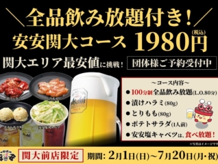2026.01.29 キャンペーン 2/1~7/20【大阪関大前店限定】全品飲み放題付きでこの価格。関… 関大前で、気軽に集まれる。飲んで、食べて、しっかり満足できる――そんな声に応える、関大前店限定の特別コースが登場しました。 2/1~7/20まで 「安安 関大コース」は、全品… 2026.01.26 お知らせ 2/2~いつもの美味しさはそのままに、北海道地区メニューを更新しま… 北海道地区のメニューは、2月2日より内容をリニューアルいたします。(こちらからご確認できます) 原材料や仕入れ環境の変化を踏まえながら、七輪焼肉安安らしい“気軽に楽しめる焼肉… 2026.01.26 キャンペーン 【2/2~2/27 感謝を込めて】店舗限定・周年記念セール開催のお… 日頃より七輪焼肉安安をご利用いただき、誠にありがとうございます。皆さまのご愛顧に支えられ、このたび各店舗が節目の周年を迎えることができました。 平塚店は1周年、藤沢石川店は6… 2026.01.19 キャンペーン 【牧港店限定】激辛好き必見。激辛ジューシーカルビ190円(税込20… 牧港店だけの限定メニューが登場しました。 ■ 激辛ジューシーカルビ 価格:190円(税込209円) 一口目から広がる辛さ。 炭火で焼き上げることで、香ばしさと辛味がさらに引き… 2026.01.19 キャンペーン 【1/19~2/28 横浜3店舗限定 日ノ出町店/イセザキモール店… ・アルコール全品 200円(税抜)均一※ビール・ノンアルコールビールは対象外 期間限定で、ドリンクを思う存分楽しめるお得なアルコールセールを開催します。 ビール・ノンアルコー… 2026.01.19 キャンペーン 【1/19~2/28 横浜エリア3店舗 横浜北口店/保土ヶ谷店/杉… 横浜エリアの3店舗、月~木限定で、お得に楽しめる飲み放題フェアを開催します。 1/19(月)~2/28(土)の月~木曜日(祝日を除く)限定。1,500円(税込1,650円)で… 2026.01.19 キャンペーン 【1/19~2/28 横浜エリア2店舗 横浜西口店/追浜店】月~木… 横浜エリアの2店舗、月~木限定で、お得に楽しめる飲み放題フェアを開催します。 1/19(月)~2/28(土)の月~木曜日(祝日を除く)限定。1,500円(税込1,650円)で… 2026.01.13 キャンペーン 【平日が断然おトク】1/16~2/27 対象12店舗限定 ハイボー… 平日のご来店がもっと楽しくなる、期間限定のおトクセールを開催します。 対象店舗では、平日限定でハイボールを1杯100円(税込110円)でご提供。 お仕事帰りの一杯にも、仲間と… 2026.01.13 キャンペーン 焼肉の満足度はご飯で決まる。今だけ“特別”価格【関東※】1/16~… 焼肉の満足度は、肉だけでは決まりません。 最後に記憶に残るのは、実は「ご飯」です。 だから七輪焼肉 安安では今だけ、 焼肉の原点とも言える“肉とご飯の黄金バランス”を 本気の… 2026.01.12 お知らせ 2/16営業日より寺田・大日・布施店(大阪3店舗限定)|深夜料金撤… 平素よりご利用いただき、誠にありがとうございます。 このたび、寺田店・大日店・布施店の3店舗におきまして、2026年2月16日営業日より、深夜料金を試験的に撤廃することとなり… 12